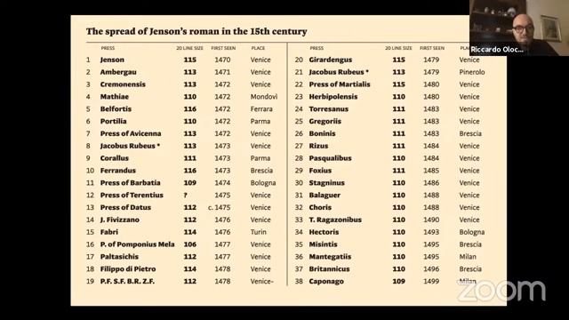 As part of the Herb Lubalin Lecture Series, Riccardo Olocco spoke about the origin of roman typefaces, the very beginning of the lowercase letterforms we are familiar with today. He will first introduce research on 15th-century types, and the methods he developed to achieve sharp images of the printed marks. He then will overview the printing revolution that took place in Venice in the last quarter of the 15th century, and introduce Nicolas Jenson, the French printer (and punchcutter). Jenson cut a roman type around 1470 that was so well assembled, so definitive in its forms, that it still represents a reference point for contemporary typeface design. Additionally Olocco will discuss Jenson’s career along with the success of his rotunda types (the Italian style of blackletter), which he cut some years later and which gained even more success with contemporaries than his roman, and compare the Jenson roman with the types that were cut in the same early years (1470–1473) showing Jenson’s letterform innovations. Finally, Olocco will follow the development of roman types and show how Jenson’s lowercase letters became the basis of all roman types to this day. The Herb Lubalin Lectures are filmed and made available with the generous support of Hoefler&Co. Riccardo Olocco is a designer and researcher, visiting research fellow at the University of Reading where in 2019 he completed his Ph.D. In the early 2010s, he lectured in Typography at the University of Bolzano, and from the late 1990s, he freelanced as a type and graphic designer in Milan and elsewhere in northern Italy. A board member of the Nebiolo History ProjectI, he has published articles and lectured across Europe. He's a member and co-founder of CAST, Cooperativa Anonima Servizi Tipografici.