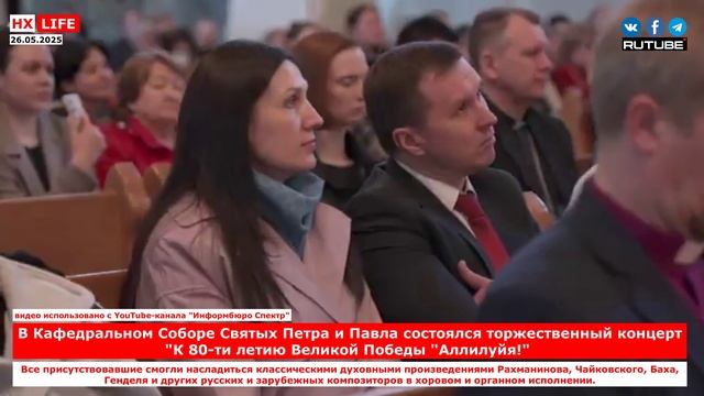 В Кафедральном Соборе Святых Петра и Павла состоялся торжественный концерт "К 80-ти летию Великой Победы "Аллилуйя!" 8 мая в Кафедральном Соборе Святых Петра и Павла состоялся торжественный концерт "К 80-ти летию Великой Победы "Аллилуйя!" Шедевры русской и европейской духовной музыки". Организатором мероприятия выступил Консультатианый Совет Глав Протестантских Церквей России. Перед началом музыкальной части прозвучали библейские строки и поздравления от официальных лиц, как бы предваряя то послание о Божьем мире, любви и победе, которое через музыку проникало в души гостей мероприятия. В это время, все присутствовавшие смогли насладиться классическими духовными произведениями Рахманинова, Чайковского, Баха, Генделя и других русских и зарубежных композиторов в хоровом и органном исполнении. Информационное бюро "Спектр", Москва ссылка: https://www.youtube.com/watch?v=fB8pbaPy-0k