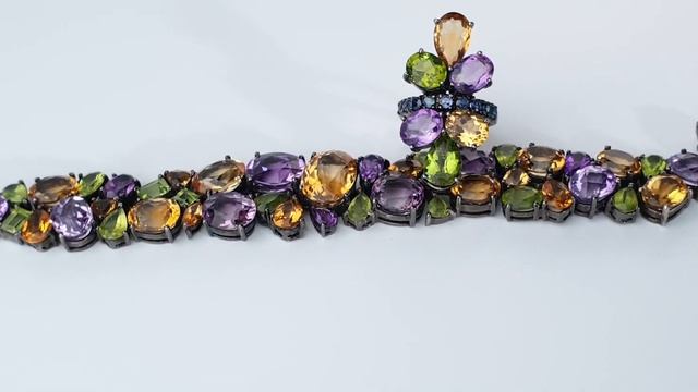 На видео представлен винтажный комплект (браслет и кольцо) с природными самоцветами (цитрин, аметист, хризолит, гранат, сапфир) в черненом серебре (Тайланд)