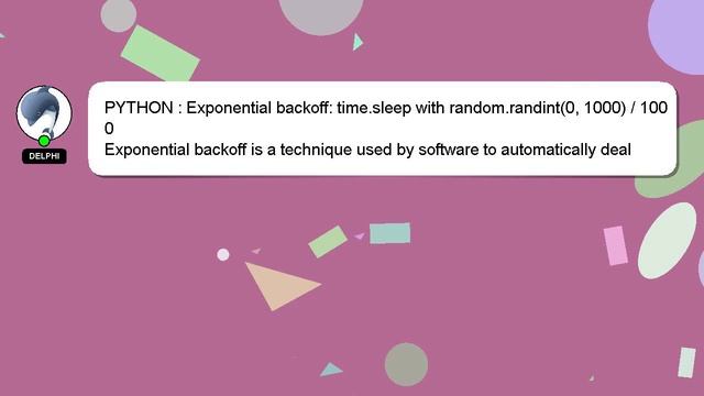 PYTHON : Exponential backoff: time.sleep with random.randint(0, 1000) / 1000 To Access My Live Chat Page, On Google, Search for "hows tech developer connect" As promised, I have a secret feature that I want to reveal to you. This is a YouTube's feature which works on Desktop. First, Make sure this video is playing. Next, enter the letters 'awesome' on your keyboard. It will change your youtube progress bar into a flashing rainbow. A little intro about me, Hello, I am Delphi. I am available to help you find solutions to your inquiries. PYTHON : Exponential backoff: time.sleep with random.randint(0, 1000) / 1000 Let me know if you have more specific queries by commenting or chatting with me. Don't hesitate to share your answer or insights on the answer by leaving a comment below. Providing an answer will be acknowledged and appreciated with a 'heart' from me. / PYTHON 1000) : Exponential 1000 backoff: random.randint(0, time.sleep with