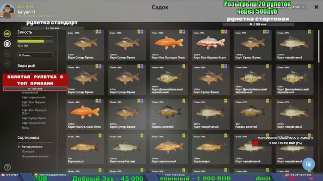 Поддержка донатом https://new.donatepay.ru/@1032463 Альтернативный донат https://www.donationalerts.com/r/kalyamba11 5536913964533059 карта Тинькоф Если стрим лагает,смотри стрим на трово https://trovo.live/s/Kalyamba_na_Ribalke Мой ВК - https://vk.com/kalyantv НИК в игре kalyan11 НАШ ДИСКОРД СЕРВЕР https://discord.gg/4ZzSQkQtsK Заказ водоема на 1 час - 500р ( весь стрим 2500р ) Модерка на канале 1200р ( каждая следующая на 100р больше) Озвучка доната на 40р,50р,100р,200р,300р,500р,1000р ✅Призы в рулетке "ЗОЛОТАЯ" ✔ ЗОЛОТО ✔ ПРЕМ ✔ КАТУШКИ РАПТОР 40, АЗИМУТ 10000, СИЛЬВЕР 80, ТАЙГА с 30 ✔ ПАЛКИ ПИЛКЕРНАЯ, ДОНКА МОРСКИЕ, ✔ РОД ПОД, СТУЛЬЯ ✅Призы в рулетке СТАНДАРТ : ✔ катушка "РАПТОР 40" ✔ катушка "АЗИМУТ 10000" ✔ катушка "ТАЙГА С30, С40," ✔ катушки 60 для медного ( ЭВИИ, НАТОРЫ, ГОЛДА, и тд) ✔ ПИЛКЕРНОЕ УДИЛИЩЕ КОРОЛЕВА ОКЕАНА ✔ Морское Донное удилище ✔ прем ( 3, 7, 30 дней) ✔ золото ( 1, 3, 5, 10, 20 ,50) ✔ билет на море ( 1, 3, 5 дней) ✔ голд наживка и др. ✅Призы в рулетке "СТАРТОВАЯ" ✔ катушка "silver80" ✔ катушка "БЕЛЫЙ КАЛИБР" ✔ катушка "Черный калибр" ✔ катушка "Протон" ✔ катушка "Нарга 6000" ✔ Набор Фидерист и спинингист ✔ Карповик Фортуна ✔ фидерные удилища ✔ прем, золото, алкашка, наживки и тд P.s Рулетка это не казино, а награда за поддержку стримера. Вечный ТОП ПОДДЕРЖКИ (11.05.2024) 1. Dimon_pokemonchik 119 784 2. Interceptor 75 508 3. Skreb79 71 261 4. une personne 68 619 5. Нарвал77 31 550