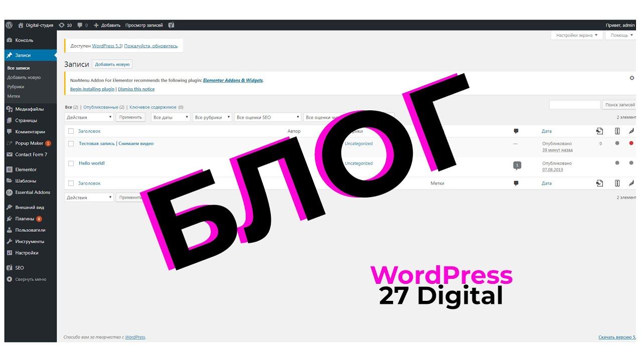Заранее спасибо за просмотр! - Привет! Сегодня будем разбираться с тем, как добавить запись в блог ан сайте ВордПресса. Разбор происходит на примере реального проекта. - Мы не делаем сайты "для красоты". Мы делаем сайты для продаж! Digital агентство полного цикла. Самое крутое решение по цене/качество именно у нас! Создание сайтов от 15.000 рублей. Сайт - http://27.ru.net Моя страничка - https://vk.com/snegirev27 Скачать приложение - https://27digital.glideapp.io/ Авито - avito.ru/27strart Отзывы о нас на Яндексе - https://yandex.ru/uslugi/profile/EkaterinaK-465314