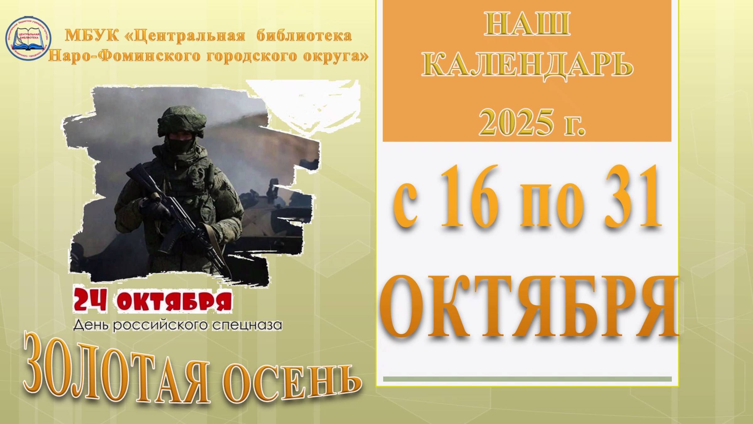 Представляем вашему вниманию «Наш календарь» знаменательных и памятных дат с 16 по 31 октября 2025 года, подготовленный ведущим библиографом МБУК «ЦБ Наро-Фоминского городского округа» Ириной Лукьяновой.