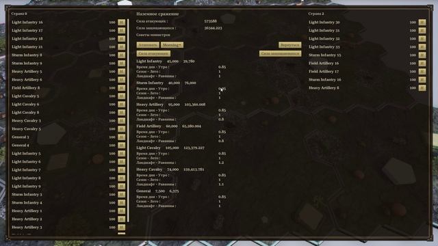 Эффективности подразделений на разных типах местности и факторы, влияющие на силу войск в сражениях