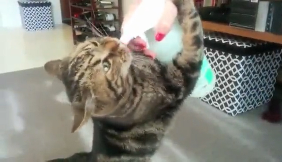 Кот Джоуи пьёт воду отовсюду. Но больше всего, конечно, любит пшикалку.