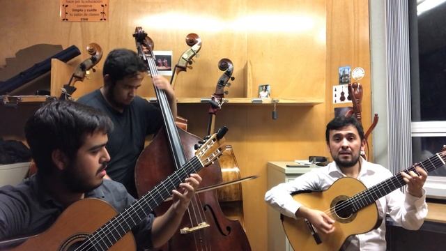 Sesión nocturna. Guitarras (izquierda a derecha): Juan José Espinoza García Jesús Enríquez Silva Contrabajo: Jorge Gabriel Rivera Sandoval. Alumnos de la licenciatura de la Facultad de Música de la U.N.A.M.