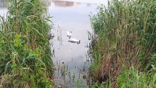 Лебеди на озере в камышах