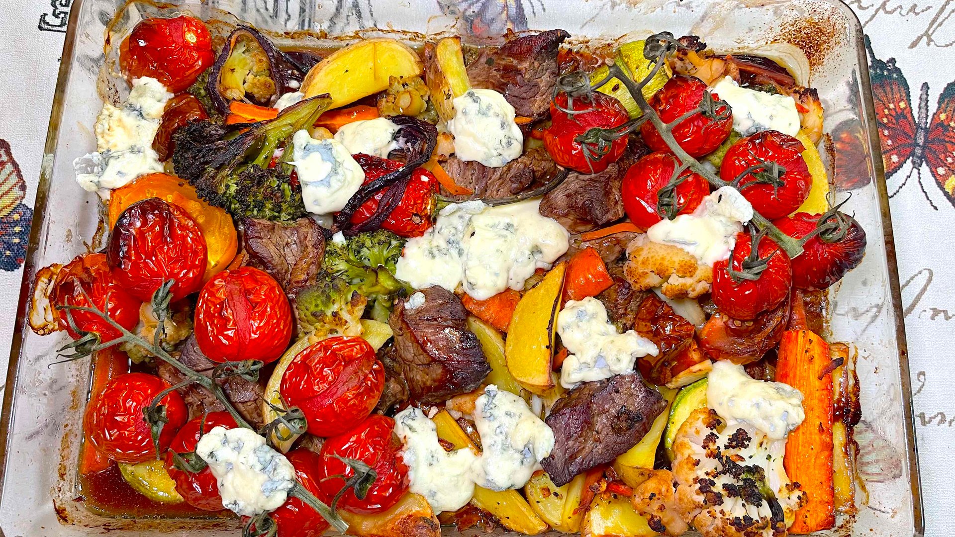 Сегодня ... овощная запеканка с мясом! Просто и очень вкусно! Берем любое мясо ... маринад ... джин, соевый соус, сок 1/2 лимона, перец, соль, оливковое масло ... если мясо жесткое лучше оставить мариноваться на ночь в холодильнике ... овощи любые ... подойдут даже замороженные ... все выкладываем в форму ... перемешиваем ... украшаем веточками черри ... и в духовку 170°С на час - полтора ... за десять минут до готовности добавьте голубой сыр ... Приятного аппетита!!!