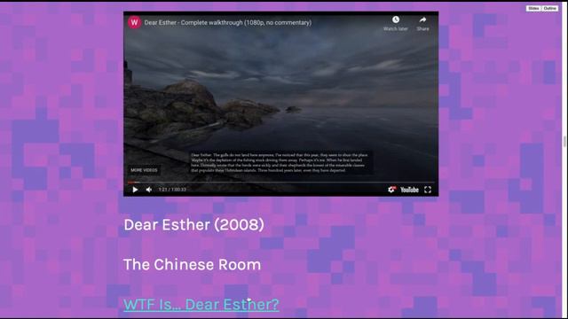 Lecture on indie games for MMP 270. Notes: https://270.owen.cool/notes/indie/ 00:00 - Overview 03:00 - ZZT 04:30 - Game Maker 06:00 - Cave Story 07:00 - Super Columbine Massacre RGP! 12:40 - Darwinia 13:50 - Syoban Action 15:00 - Passage 17:00 - flOw 19:45 - Dear Esther 22:00 - The Graveyard 25:00 - World of Goo 26:00 - Braid 28:00 - Blueberry Garden 29:00 - Minecraft 29:30 - dys4ia 31:00 - Depression Quest 32:00 - Papers, Please 33:00 - Oquonie 34:00 - STEP 35:00 - Plug & Play 35:30 - Stardew Valley 37:00 - Links