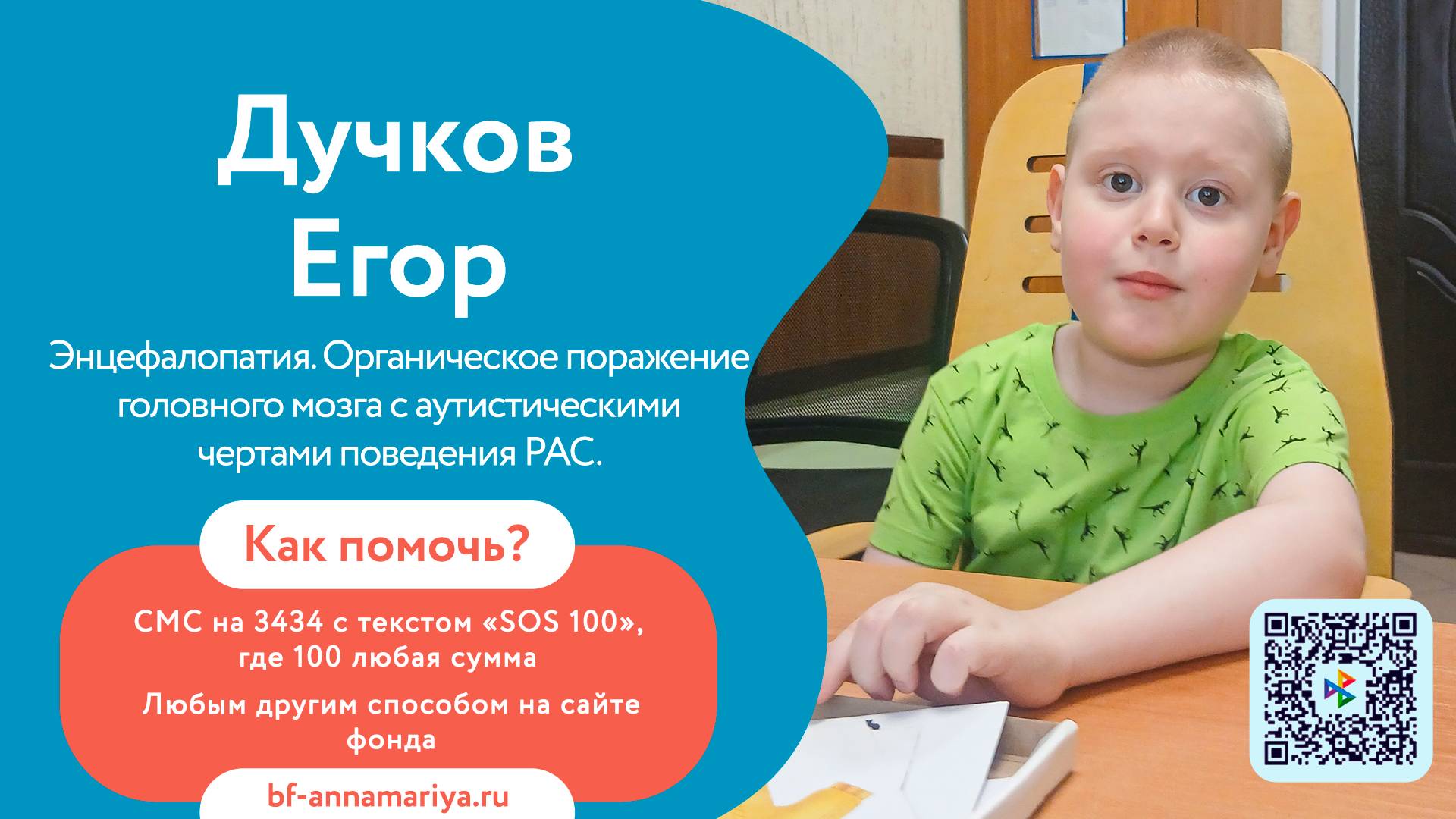 Подарите Егору надежду на выздоровление! Дорогие друзья, мы обращаемся к вам с историей маленького мальчика Егора, который с раннего возраста борется с тяжелыми диагнозами — поражение головного мозга,ЗПР, РАС. Благотворительный фонд «Анна Мария» проводит сбор средств на реабилитацию Егора в центре г. Самара. До1,5 лет Егор развивался как обычный ребенок, но затем его поведение резко изменилось — мальчик стал пассивным, практически не проявлял интереса к окружающему миру. После долгих обследований Егору поставили инвалидность. Сейчас, в 5 лет, он делает успехи в развитии благодаря регулярным курсам реабилитации, но впереди еще долгий путь. Егор очень любознательный и жизнерадостный мальчик. Он с удовольствием читает книги, гуляет с семьей, отмечает праздники. Но из-за проблем с речью порой становится грустным,ведь не может даже задуть свечи на дне рождения. Впереди у Егора новый курс реабилитации, который так необходим, но семья не может позволить себе такие расходы. Давайте поможем Егору обрести надежду на выздоровление! Любое ваше пожертвование будет огромной поддержкой для него. Как помочь: 🔵 СМС на 3434 с текстом «SOS 100» (где 100 — любая сумма) 🔵 Пожертвовать онлайн на сайте фонда - https://bf-annamariya.ru/2223-duchkov-egor.html Вместе мы сможем подарить Егору шанс на счастливое будущее!