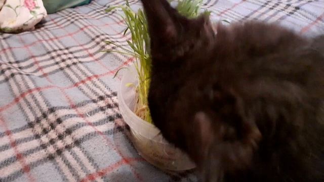 Котёнок Мишка постарше, пощипывает травку а котёнок Тишка ещё мелкий и нифига не понимает.