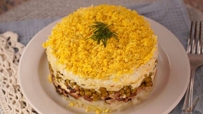 Слоёный салат со шпротами, сыром и горошком