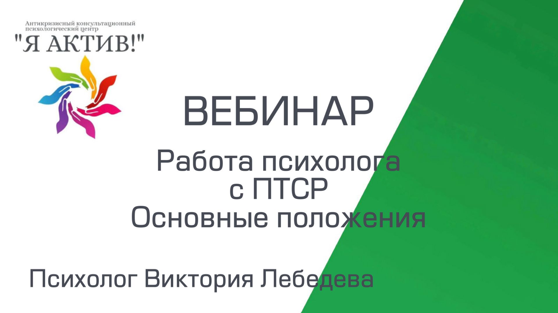 Вебинар провела психолог Центра «Я Актив!» Виктория Лебедева ______ «Я Актив!» - антикризисный консультационный психологический центр; специализируется на оказании психологической помощи людям, попавшим в трудную жизненную ситуацию. Каждый специалист Центра имеет высшее психологическое/педагогическое образование, отраслевое повышение квалификации, богатый опыт работы с самыми сложными психологическими ситуациями. Психологи в нашем проекте работают на добровольной основе, б е с п л а т н о. Для получения психологической консультации оставляйте заявку на нашем сайте www.center-active.ru Психолог с Вами свяжется!