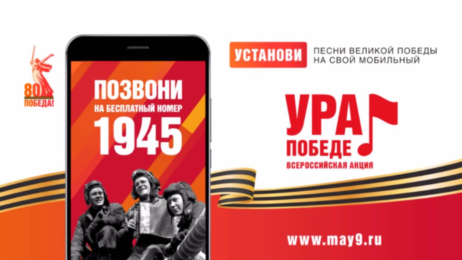 25 февраля — 15 мая 2025 года НАБЕРИТЕ БЕСПЛАТНЫЙ КОРОТКИЙ НОМЕР 1945 — Установите любимые мелодии Победы вместо гудка или звонка на телефоне! — Слушайте голос Левитана — ежедневные сводки Совинформбюро! — Получите ссылку на загрузку логотипа 80-летия Победы! — Присоединяйтесь к акции, расскажите о ней своим близким, друзьям, коллегам. Подробная информация на официальном сайте юбилея Великой Победы — may9.ru/events/urapobede Акция проводится операторами мобильной связи при поддержке Минцифры России. Все сервисы — бесплатные. #Победа80 #УраПобеде