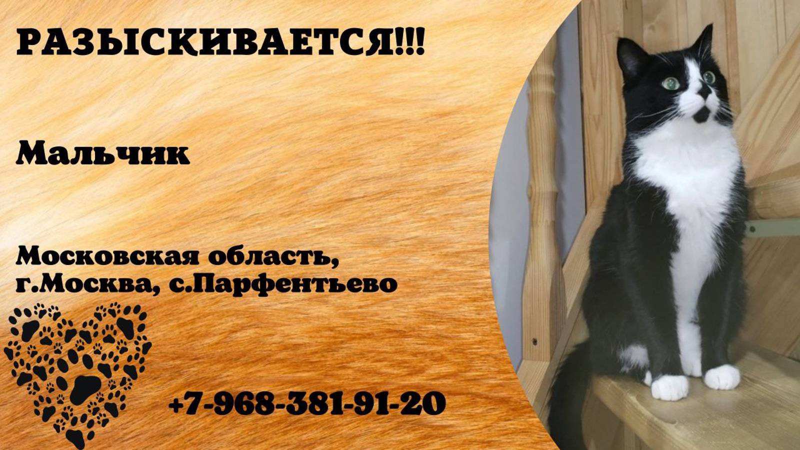 Московская Москва Парфентьево Пропал кот ПРОПАЛ КОТ!!! В с. Парфентьево 26.10.2024г. пропал кот. Окрас черно- белый. Огромная просьба нашедшего сообщить по номеру 89683819120. Инфо https://vk.com/wall-198815410_158729 Автор https://vk.com/id306385411