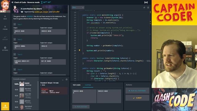 In this Reverse Mode Clash of Code, we are tasked with parsing invoices and incrementing their invoice numbers. A tricky little puzzle with several edge cases! With only 15 minutes to complete the challenge, you get to watch me sweat my way through this challenge while I talk through my thought process. I hope you find this video useful! Clash of Code is a programming challenge on the CodinGame website. Check it out here: https://www.codingame.com/ Start learning C# at https://csharp.captaincoder.org/ Special thanks to StreamBeats for their Copyright free music: https://www.streambeats.com/