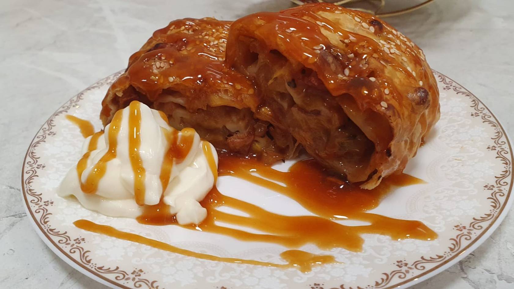 Штрудель с слегка вялеными яблоками, киви на слоёном бездрожжевом тесте.Творожный крем и карамель
