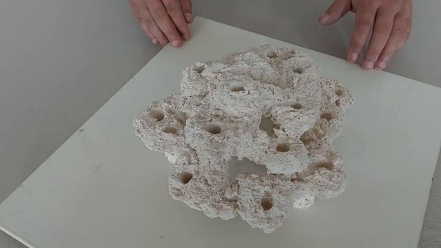 Декорация с габаритными размерами 26 х 23 х 12 см, по изделию выполнено 16 отверстий под ножку плашки ( плашками не комплектуется). Данная декорация выполнена в максимально приближенном варианте к природным СРК или ЖК, а в частности, её формой и фактурой. Поверхностные поры данного изделия все открыты, что значительно улучшает проток воды через тело самой декорации. Отлично подойдёт как центральный элемент скейпа для средних аквариумов, а так же как составной модуль для формирования скейпа в большие аквариум