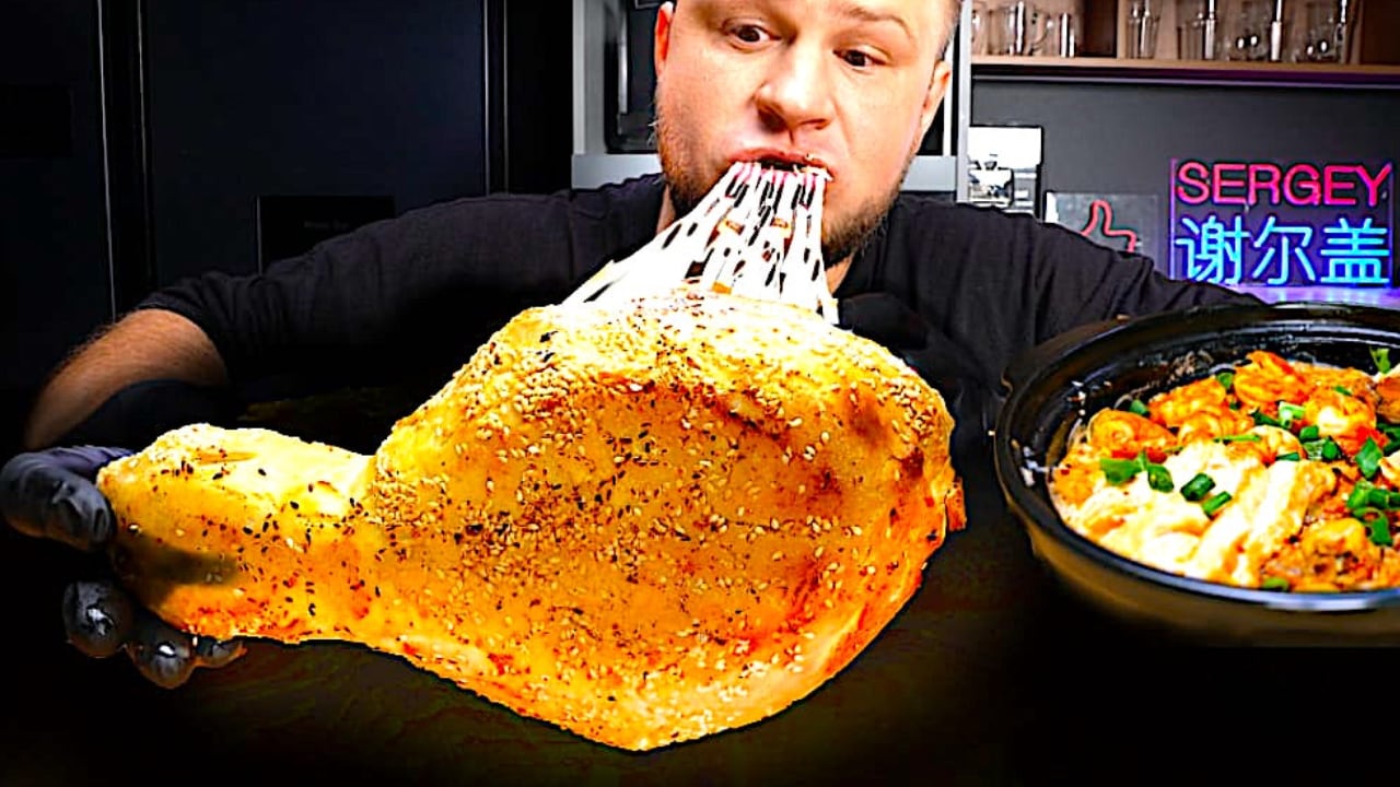 АСМР / МУКБАНГ КОПЧЕНАЯ НОГА ИНДЕЙКИ С СЫРОМ В ТЕСТЕ / РИСОВАЯ ЛАПША С МОРЕПРОДУКТАМИ