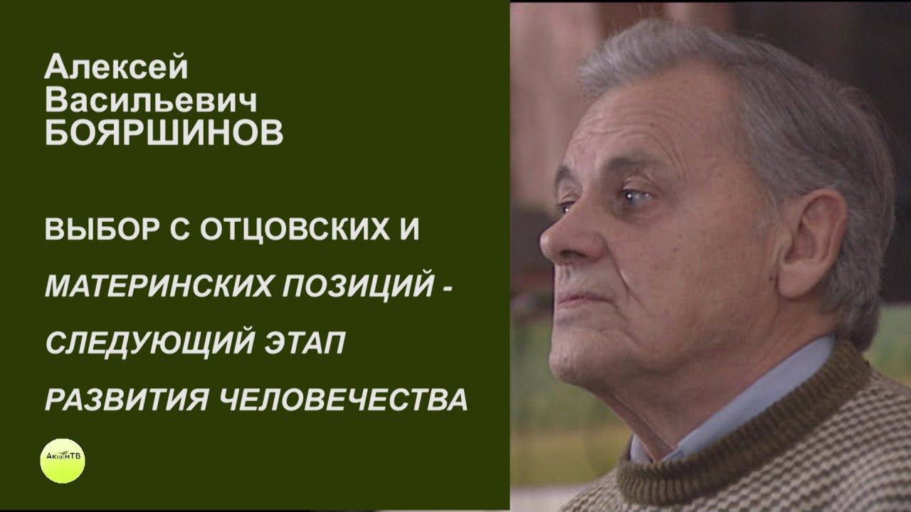 ВЫБОРЫ ОТ МАТЕРИНСКИХ И ОТЦОВСКИХ ПОЗИЦИЙ - СЛЕДУЮЩИЙ ЭТАП РАЗВИТИЯ ЧЕЛОВЕЧЕСТВА Алексей Васильевич БОЯРШИНОВ, автор открытия на ствке науки и искусства "Акцентированное осознание духовных процессов" Использована архивная запись 1993 г. Акцент ТВ Поддержать канал карта Сбербанка - 2202 2005 9631 3880 Мы в соцсетях: ВКонтакте - https://vk.com/akcentv Канал "Акцент ТВ" ВКонтакте - https://vk.com/club36535968 Алексей Васильевич Бояршинов ВКонтакте - https://vk.com/prp_kovcheg Поселение Родовых поместий Ковчег