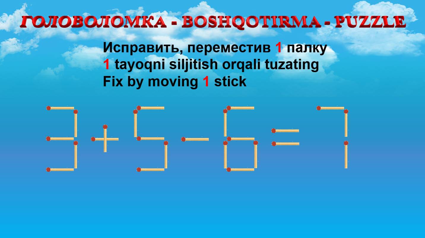 ГОЛОВОЛОМКА - BOSHQOTIRMA – PUZZLE. Спичка. 3+5-6=7, 2+8-3=6, 9-5+5=4, 4-2+8=12