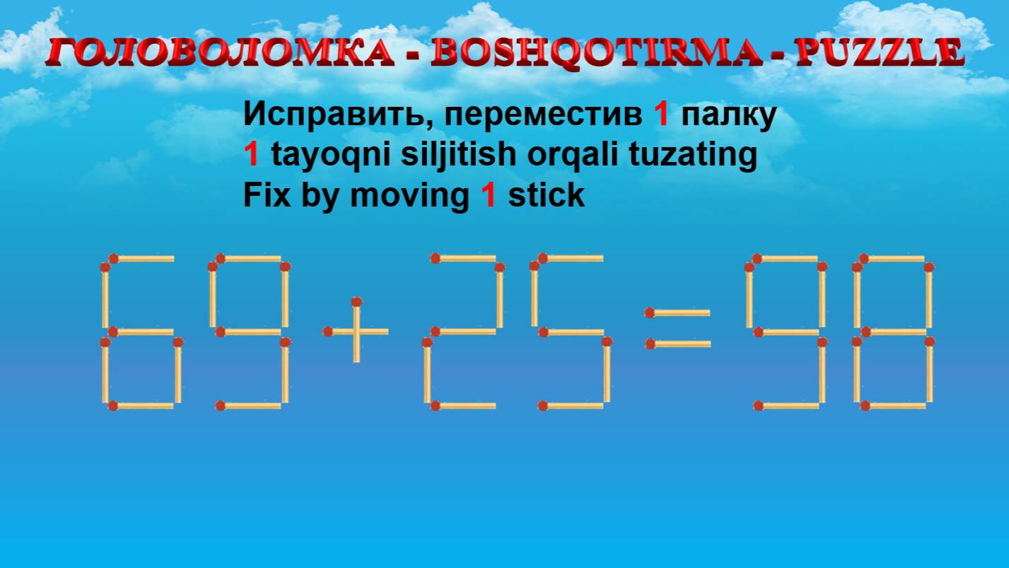 ГОЛОВОЛОМКА - BOSHQOTIRMA – PUZZLE. Спичка. 99+33=52, 68+29=99, 62+28=62, 69+25=98