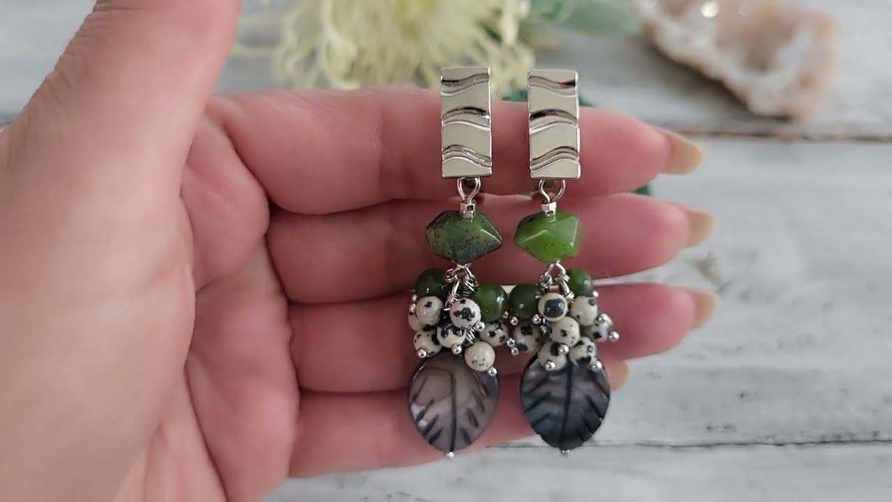 Серьги украшения из натуральных камней. Серьги гроздь из нефрита, яшмы перепелиной, перламутра: нефрит шарик 6 мм., квадрат 7х10 мм. с гранями, яшма перепелиная шарик 4 мм., перламутр лист резной 15х20 мм., фурнитура люкс покрытие родий 14 мк., длина до швензы 47 мм., вес пары 17 гр. купить украшения можно в нашем магазине https://www.livemaster.ru/samotsvety-ot-granat-mk?view=profile