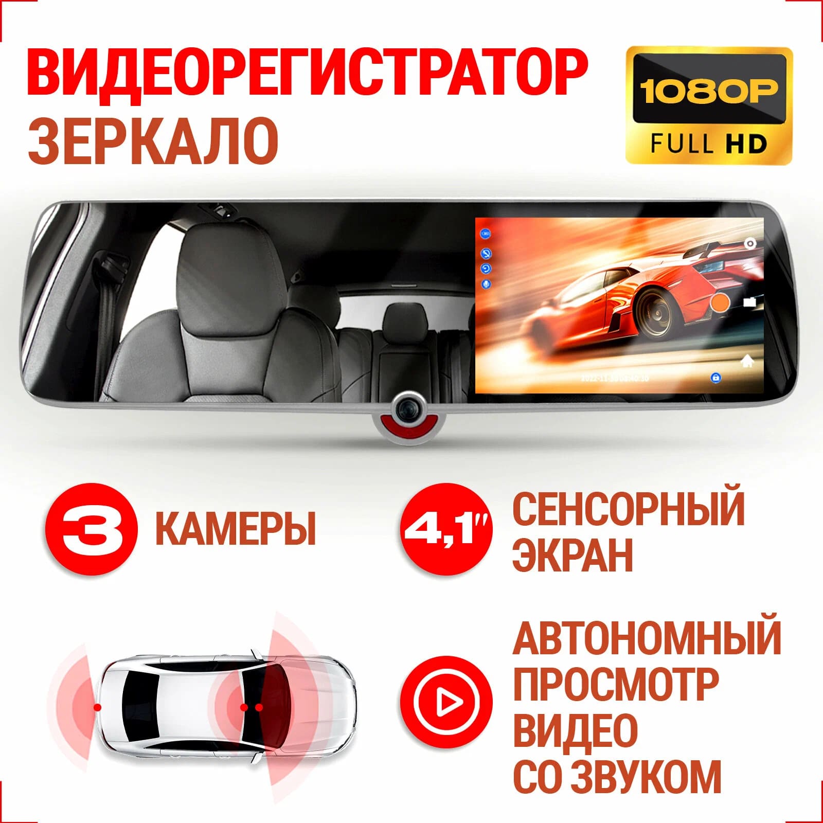 Автомобильный видеорегистратор зеркало Carowell HD Trio, FULL HD