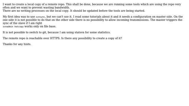 DevOps & SysAdmins: Create read-only repo from remote repo and update it regularly Helpful? Please support me on Patreon: https://www.patreon.com/roelvandepaar With thanks & praise to God, and with thanks to the many people who have made this project possible! | Content (except music & images) licensed under CC BY-SA https://meta.stackexchange.com/help/licensing | Music: https://www.bensound.com/licensing | Images: https://stocksnap.io/license & others | With thanks to user CSchulz (serverfault.com/users/71177), and the Stack Exchange Network (serverfault.com/questions/482689). Trademarks are property of their respective owners. Disclaimer: All information is provided "AS IS" without warranty of any kind. You are responsible for your own actions. Please contact me if anything is amiss at Roel D.OT VandePaar A.T gmail.com