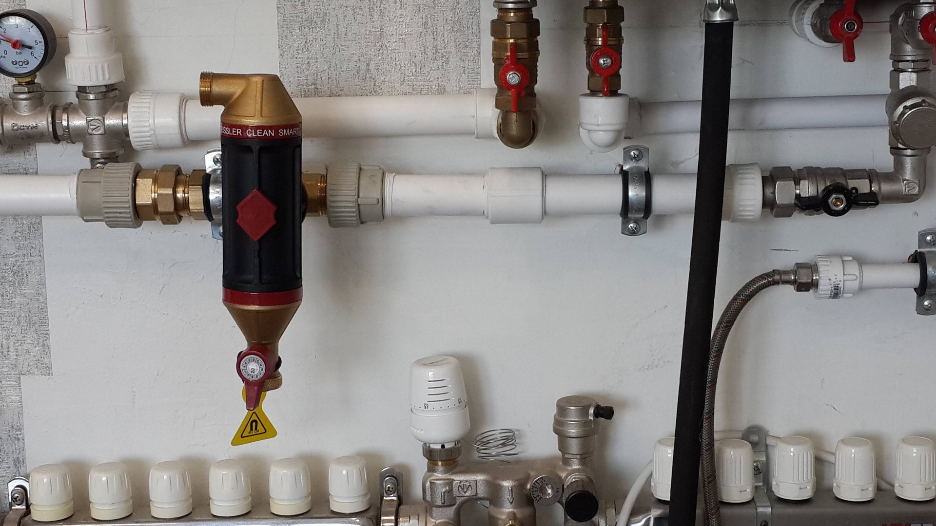 После четырёх лет работы пришлось заменить радиатор вторичного контура. Котёл перестал греть горячую воду. Было принято решение установить сепаратор воздуха и шлама, что бы защитить систему обогрева и радиатор вторичного контура.