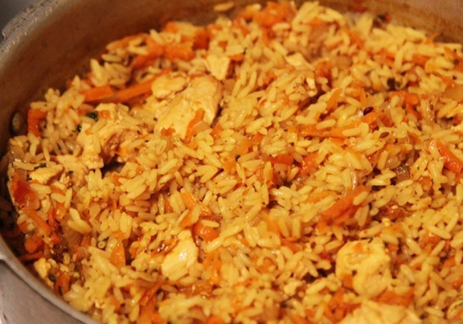 Пропаренный рис 400 гр Куриное филе 600 гр Вода 900 мл Барбарис 20 гр Лук 1 шт. Морковь 1 шт. Растительное масло 50 мл Чеснок 3 зубч. Куркума 1 чайн.л. Паприка 1 чайн.л. Хмели-сунели 1 чайн.л. Зира 0.5 чайн.л. Перец черный молотый по вкусу Соль по вкусу