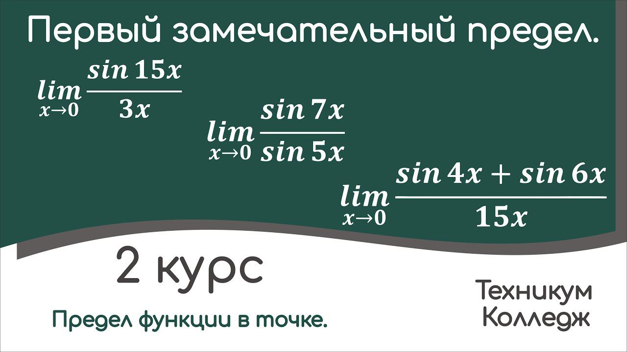2 курс. Техникум, колледж. 10-11 класс. Первый замечательный предел. Разбор домашнего задания. Предел sin(x)/x при x стремящемся к нулю. Примеры вычисления пределов функции в точке с использованием первого замечательного предела. Пример вычисления предела функции в точке, раскрытие неопределенности вида 0 на 0. Предел функции в точке. Пример нахождения предела. 00:13 Пример 1. 01:06 Пример 2. 02:44 Пример 3. Поддержать автора: https://yoomoney.ru/to/4100118156988006 Ссылка на мой Яндекс Дзен "Волкова Е.Н. Понятная математика. Техникум и колледж." - https://dzen.ru/video/watch/659569f1438ebb098709292c