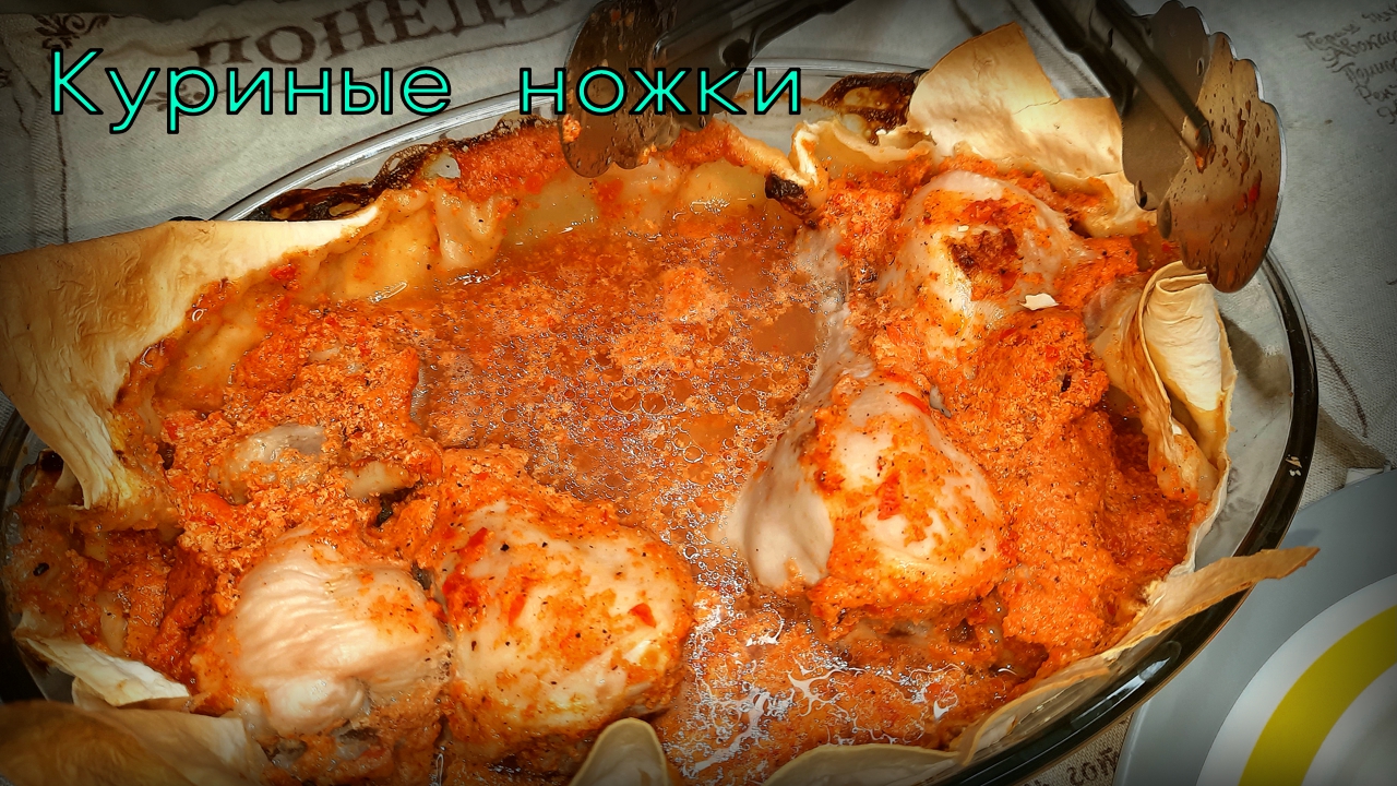 Куриные ножки, запечённые на лаваше, в соусе из кефира и сладкого перца.