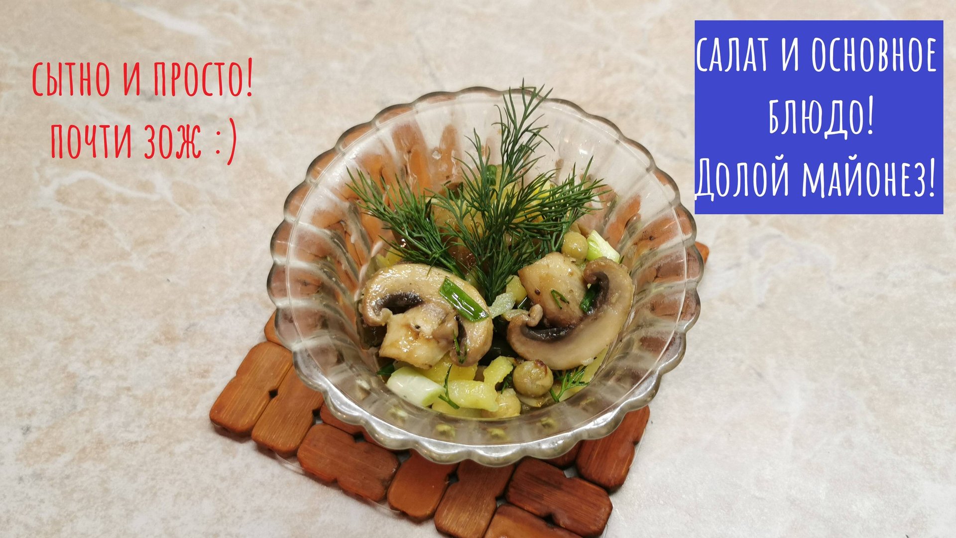 Все, мазик остался в праздниках. Простой рецепт салата (или основного блюда). Нужно: шамппиньоны, отварной картофель, соленый огурец, горошек, зелень, лук, специи и масло растительное. Грибы обжариваем с луком. Картофель и огурец рубим кубиком. Все соединяем, добавляем консервированный горошек, зелень, специи повкусу. Заправляем растительным масло, перемешиваем и даем немного постоять. Все! Можете добавить чеснока, не жареного лука и тд. и тп. Все сказанное в видео - субъективное мнение автора, которое не претендует на истину. Это развлекательный контент. Автор не повар и дегустатор, ничего не умеет, не знает и ни в чем не разбирается. Не согласны с мнением - ваше право. Но, мат и оскорбления в комментариях - бан. Уважайте себя и других! Канал 18+!