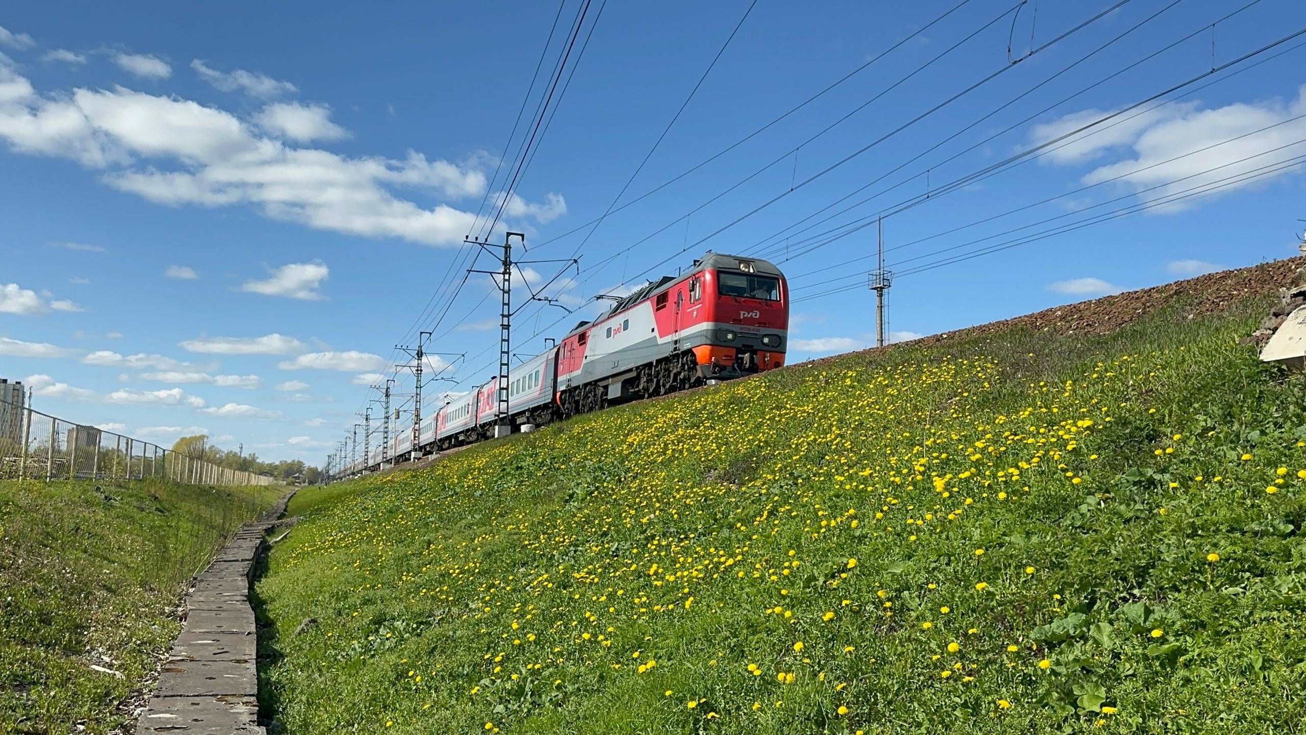 "Приветливый и одуванчики!" Электровоз ЭП2К - 036 с поездом «Поволжье» на перегоне, май 2025 года