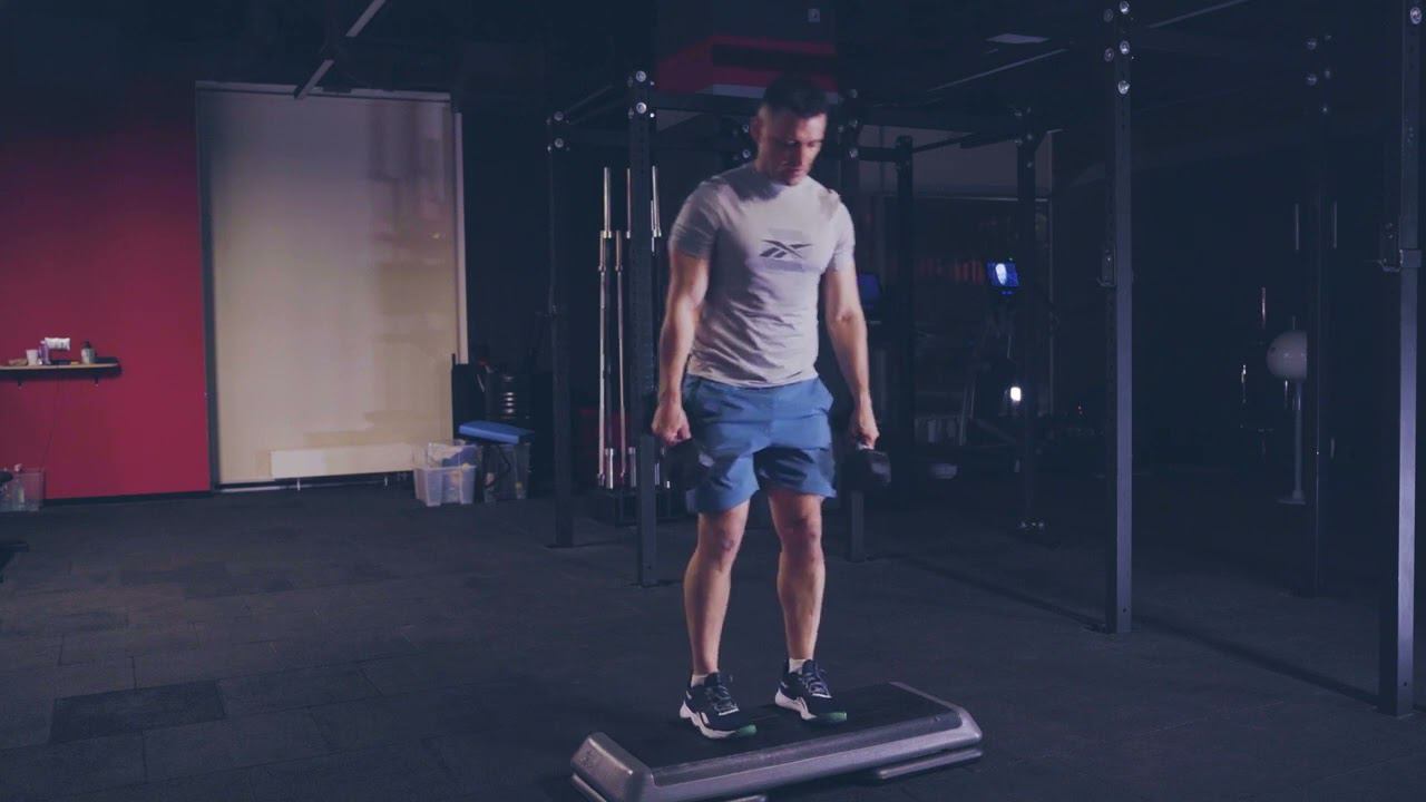 Попеременный выпад назад с возвышенности с двумя гантелями/ Alternative dual DB reverse lunge
