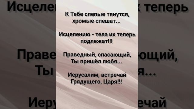 ХРИСТИАНСКИЕ ПЕСНИ ДЛЯ ХВАЛЫ ПОКЛОНЕНИЯ ПРОСЛАВЛЕНИЯ ЕВАНГЕЛИЗАЦИИ ДУХОВНОГО РОСТА ПРОБУЖДЕНИЯ ВОЗРОЖДЕНИЯ #господь#музыка#христианская_музыка#музика#христианскиепесни#бог#христианскиестихи#любовь#христианство#стихи#песня#песни#иисус#иисусхристос#иисусмойбог#иисус_христос#иисусбог#иисусгосподь#хвалы_и_поклонения#хваление#хвала#прославление#духсвятой#духовныйрост#духовноепробуждение#духовность#евангелие#евангелизация#евангельскаявесть#духовный_рост#пробуждение#рождество#рождествохристово#божий#божийнарод#божьеслово  #ХристианскаяПесня #ХристианскоеПоклонение #ХристианскаяНоваяПесня #ПастырьМоейДушы #ХристианскаяМузыка #ПесняСлавы #Иисус #ЛюбовьБожья #ХристианскиеТексты #СлаваГосподу #ВераИПоклонение #ВечнаяЛюбовь #RussianChristianSong #RussianChristianWorship #RussianChristianMusic #RussianWorship #NewRussianChristianMusic  #RussianChristianMusic #RussianSongOfPraise #Jesus #GodsLove #ChristianLyrics #GloryToGod #RussianFaithAndWorship #EternalLove #Пасха #Воскресение #ХристосВоскрес #пробуждение #возрождение https://stihi.ru/avtor/zhanna70 "ОСАННА В ВЫШНИХ!!!" СЛОВА, МУЗЫКА, ОБРАБОТКА: ЖАННА ВОЛКОВА-ВАРЛАМОВА Стихи Жанна Юрьевна Волкова-Варламова https://stihi.ru/2025/04/13/2870 1 КУПЛЕТ На дороге пыльной к городу Святому...  Ехал всадник кроткий на осле простом!  Не в доспехах царских, не по-царски гордо...  Он принёс Спасение всем в - сердце золотом!!!  ПРИПЕВ: Осанна! Осанна! Благословен Грядущий во имя Господне! Осанна! Осанна! Сын Давидов... Царь в Иерусалим пришёл! 2 КУПЛЕТ Люди радостно встречали...Дали ввойти...  Одежды снимали перед Тобой на пути!  Дщерь Сиона, ликуй, торжествуй, хвали сильней!  Царь твой в Иерусалим ввошёл, нет Его добрей!!!  БРИДЖ В храме громким голосом Ты остановил людское зло...  Сказал: Дом молитвы - это не вертеп воров!!!  Столы менял опрокинул...разлетелся товар...  Святости и правды разгорелся сильный пожар!!!  ПРИПЕВ: Осанна! Осанна! Благословен Грядущий во имя Господне! Осанна! Осанна! Сын Давидов... Царь в Иерусалим пришёл! 3 КУПЛЕТ К Тебе слепые тянутся, хромые спешат...  Исцелению - тела их теперь подлежат!!!  Праведный, спасающий, Ты пришёл любя...  Иерусалим, встречай Грядущего, Царя!!!  ПРИПЕВ: Осанна! Осанна! Благословен Грядущий во имя Господне! Осанна! Осанна! Сын Давидов... Царь в Иерусалим пришёл! 4 КУПЛЕТ Слава!!! Осанна!!! Восхваляем Тебя!!!  Нашего Спасителя! Грядущего, Царя!!!  Истины в сердцах совершай Свой обряд...  Даруя Вечности Своих золотых наград!!!  ПРИПЕВ: Осанна! Осанна! Благословен Грядущий во имя Господне! Осанна! Осанна! Сын Давидов... Царь в Иерусалим пришёл! ЗАКЛЮЧЕНИЕ: Осанна в вышних!!!  Благословен Грядущий!!!  Осанна Сыну Давида!!!  Осанна в вышних!!! 13.04.2025 Жанна Волкова-Варламова