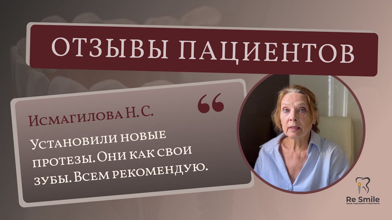 Получите БЕСПЛАТНУЮ ДИАГНОСТИКУ в нашей клинике Resmile. Ждем вас!! resmileclinic.ru Исмагилова Н. С. из Уфы обратилась в клинику ReSmile для протезирования зубов. У неё стояли временные мостовидные протезы, срок службы которых истек. Ортопед Гурин Максим Игоревич с первых дней проявил внимательное отношение к лечению. Он проводил ежедневные приемы, делал слепки, изготовил и установил металлокерамические протезы. Результатом работы врача пациентка осталась очень довольна, отметив, что новые протезы ощущаются как свои зубы, выглядят красиво и удобны в использовании. Исмагилова Н. С. выражает благодарность Максиму Игоревичу за его профессионализм и рекомендует клинику ReSmile всем, в том числе иногородним пациентам, для качественного протезирования зубов. Стоматология ReSmile это: ★ Высокотехнологичный центр современной стоматологии и имплантологии. ★ Безболезненные методы протезирования в короткие сроки с гарантией. ★ Полный спектр услуг по лечению и профилактике зубов. ★ Разумная и доступная стоимость услуг. ★Бесплатная диагностика перед хирургическим лечением.   +7 (499) 460-47-95  Москва, Огородный пр., д.19, стр.2 Смотрите наши ролики! Подписывайтесь на канал! Будьте здоровы! ПОЛЕЗНО?! ПОСТАВЬ ЛАЙК Мы в интернете: Сайт: https://resmileclinic.ru ВКонтакте: https://vk.com/resmile_clinic Инстаграм: https://instagram.com/resmile_msk?igs.. #зубы #shorts #shortsvideo #стоматолог #виниры #лечениезубов #имплантациязубов #элайнеры #красиваяулыбка #лечениезубовотзывы #коронканазуб #удалениезуба #клиникамосква #отзывы #гигиеназубов #технологиистоматологии #заботаопациенте #качественноелечение #заботливыйподход #восстановлениезубногоряда #технологииимплантации #уникальнаясистемаимплантов #протезфиксациянавинтах #зубнаяимплантация #имплантыroott #здоровыезубы #восстановлениезубов #заботавысшегоуровня #бесплатнаядиагностика #здоровыезубы #заботаозубах #стоматология #стоматологическиесоветы #зубызабота #кровоточивостьдёсен #слабыедесна #лечениегингивита #лечениепарадонтита #заботаозубах #стоматология #уходзадеснами #лечениекровоточивости #гингивит #пародонтит #стоматологическиесоветы #зубызабота #стоматология #стоматологиямосква #лечениегингивита #лечениепарадонтита #заботаозубах #стоматология #уходзадеснами #лечениекровоточивости #гингивит #пародонтит #стоматологическиесоветы #зубызабота #стоматология #стоматологиямосква #resmile