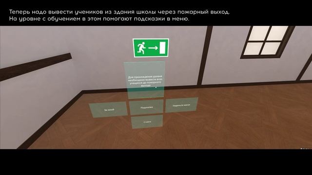В рамках проекта игрок на реальном примере знакомится с алгоритмом действий в случае пожара. Есть уровень обучения и контроля (задача: вывести учеников из горящего класса). Проект разработан в рамках Varwin Хакатон 2022.