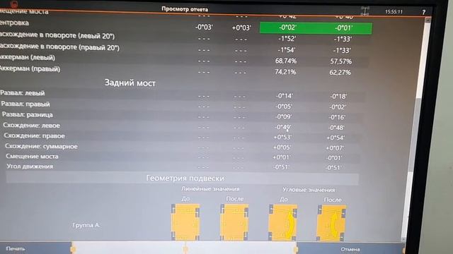 Этот разговор был пару лет назад. Я это у себя в заметках зафиксировал и когда появился подопотный, то решил вставить это объяснение от Бориса Сергеевича (г.Москва) [09.04.2021] Боря Aligner Потому что у тебя именно разворот заднего моста, почти в чистом виде. Хотя есть и небольшое продольное смещение 9мм. А переднюю ось во время движения разворачивает по вектору тяги, хотя физически она в норме. Я уже где-то писал не раз, что любой стенд показывает геометрию осей в движении. Это надо учитывать. Почти аналогичную ситуацию можно смоделировать на любом новом авто с имеющим регулировку заднего схождения, вывернув задние колеса в одну сторону градуса на 2, и сделав после этого замер геометрии. Увидим дикое смещение как передней, так и задней оси. В конкретном случае смещение относительно небольшое, потому что вся задняя ось физически развернута По аналогии, если развернуть негнутый задний неразрезной мост, то смешение осей задних колес будет нулевым, а на передней оси появится большое продольное смещение. [09.04, 07:46] Александр Лазарев: Грубо говоря...в вычислении задняя ось это точка отсчёта...верно? [09.04, 12:31] Боря Aligner Москва: Вобщем да, но с оговорками. Задняя ось неуправляемая, поэтому задает вектор тяги. А передняя (управляемая) ось на ходу подстраивается под заднюю. Вообще, тема плоскостной геометрии в сход- развале имеет много нюансов. И если глубоко вникать, можно получить конгитивный диссонанс головного мозга , как говорят психиатры. Не всегда можно влоб верить тому, что рисует программа. Это связано с тем, что программа не распознает некоторые вещи и трактует их по своему, но в конце регулировки приходит к приемлемому результату. В частности это касается поперечного сдвига осей. Она видит что оси взаимно сдвинуты друг относительно друга, но без доп. мишеней на кузове она не может определить, какая ось конкретно сдвинута. Программа трактует поперечный сдвиг осей, как изменение вектора тяги задей оси и предлагает за счет изменения заднего схождения заставить задние колеса двигаться в одной колее с передними, что в принципе правильно. Но как побочный эффект получаем продольное смещение задних колес.
