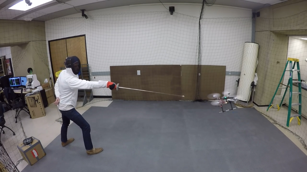 Ученый из Стэнфордского университета разработал для беспилотников систему уклонения от движущихся препятствий. Для демонстрации возможностей системы ученый записал и опубликовал ролик, в котором он атакует квадрокоптер при помощи фехтовальной шпаги.