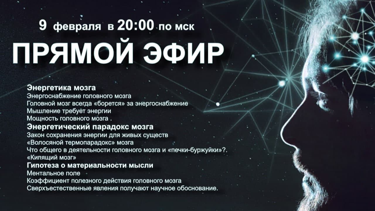 9 февраля в 20:00 | ТВ ЭКСТРА: Специальный прямой эфир с физиком и исследователем. Геннадий НЕПОКОЙЧИЦКИЙ Гипотеза о материальности мысли Основные темы для обсуждения в прямом эфире: Энергетика мозга Энергоснабжение головного мозга Головной мозг всегда «борется» за энергоснабжение Мышление требует энергии Мощность головного мозга . Энергетический парадокс мозга Закон сохранения энергии для живых существ «Волосяной термопарадокс» мозга Что общего в деятельности головного мозга и «печки-буржуйки»?. «Кипящий мозг» Гипотеза о материальности мысли Ментальное поле Коэффициент полезного действия головного мозга Сверхъестественные явления получают научное обоснование. Ведущий эфира - руководитель и автор канала ТВ ЭКСТРА, организатор интерактивной конференции НЕПОЗНАННОЕ - Денис Овсянников ______ https://www.facebook.com/groups/tvextra/ - группа телеканала в Фейсбук https://t.me/nepoznannoe_online - подписывайтесь на телеграмм канал www.TVExtra.ru