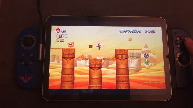 Joy Cons are wirelessly connected to Nintendo Switch, physically connected to 3D printed Joy Con grip. Switch HDMI output goes into USB-C UVC adapter (what's called "capture card" in layman's terms) with a USB C angle adapter for good measure