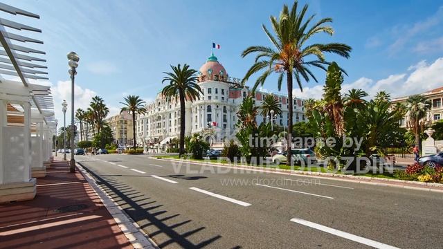 France, Nice, 14 09 2015: Hotel Negresco, promenade de Anglais, traffic, clear sky, clouds
