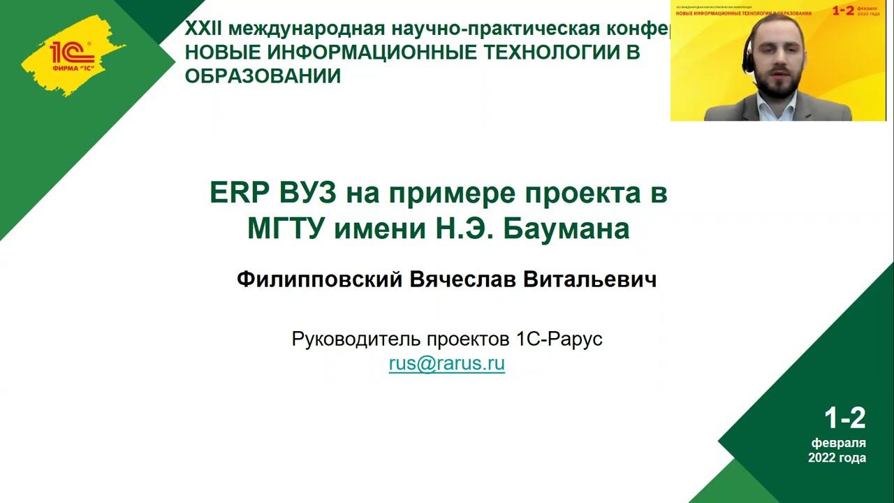 Доклад руководителя проектов "1С-Рарус" Вячеслава Филипповского на конференции "Новые информационные технологии в образовании", февраль 2022 г. Тема доклада: «1С:ERP для ВУЗов на примере проекта в МГТУ им. Н.Э. Баумана».