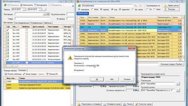 После получения от аптеки заявки на товар поставщики присылают подтверждение (полное или частичное) на заказ. Посмотрев данный видеоролик, Вы научитесь оперативно дозаказывать отказанные позиции в случае частичного подтверждения. http://eprica.ru