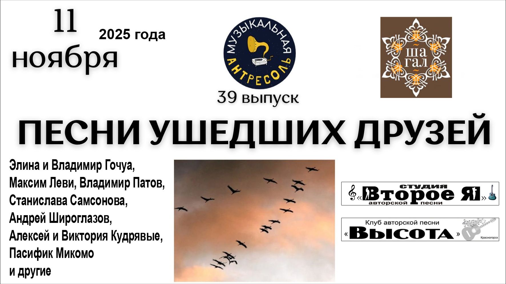 Участники: Элина и Владимир Гочуа (руководители проекта и ведущие), Максим Леви, Владимир Патов, Станислава Самсонова, Андрей Широглазов Алексей и Виктория Кудрявые, Пасифик Микомо (Республика Конго). На «свободном» микрофоне выступили: Антон Чернятьев, Дмитрий Гурьев, Виктория Кудрявая, Сергей Гороховский, Александр Сошенко, Алексей Коровин. Продолжительность – 2 часа 34 минуты. Клуб «Шагал»: Москва, улица Кржижановского, дом 14, корпус 2 (метро «Профсоюзная»). 11 ноября 2025 года.