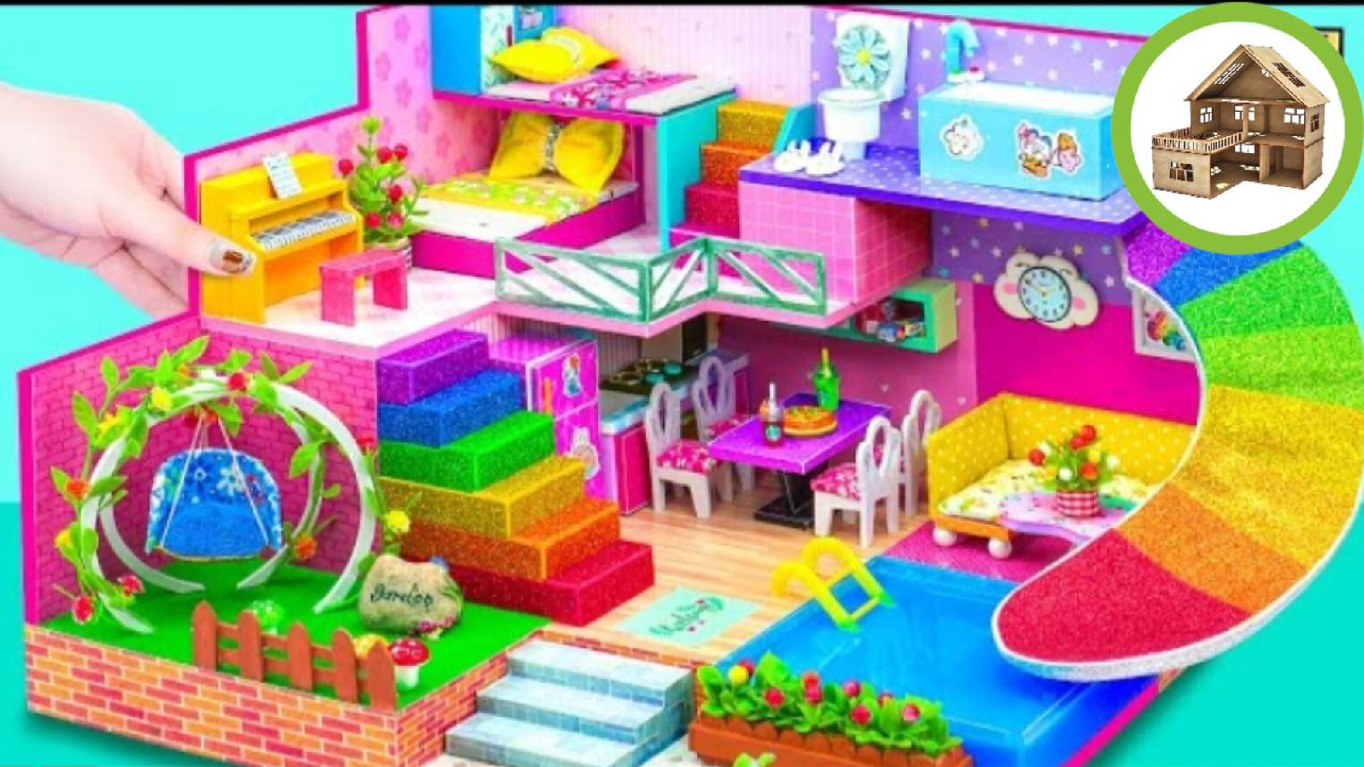 Миниатюрный домик с двумя спальнями на чердаке и воднуая горка с крыши к бассейну из картона /286