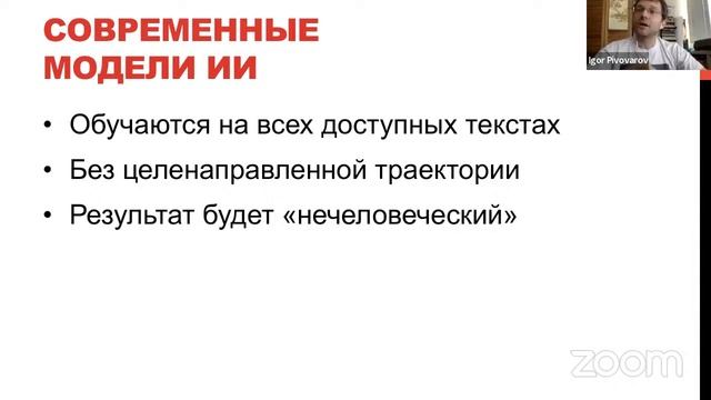 Некоторые соображения по поводу мышления и понимания у людей и какое это окажет влияние на создание/обучение AGI — Игорь Пивоваров Семинар русскоязычного сообщества AGI 14 июля 2022 https://ridero.ru/books/terbiden_prostaya_model_slozhnogo_mira/ https://agirussia.org/ Мы ведем группы и организуем семинары русскоязычного сообщества разработчиков систем AGI (Artificial General Intelligence или Общий Искусственный Интеллект) или Strong AI (Сильный Искусственный Интеллект), а также - являющийся их частным случаем HLAI (Human-Level Artificial Intelligence или Искусственный Интеллект Человеческого Уровня). Группы: https://t.me/agirussianews (новостной канал) https://t.me/agirussia (основная) https://t.me/agiterms (вопросы терминологии) https://t.me/agibots (разговорный интеллект) https://t.me/agifintech (финансовые технологии) https://t.me/collectivei (коллективный интеллект) https://vk.com/agirussia https://www.facebook.com/groups/agirussia (основная) https://www.facebook.com/groups/socialintelligence (коллективный интеллект) https://groups.google.com/g/agirussia Онлайн-семинары идут по четвергам, в 18:00 по Московскому времени. Продолжительность два часа, обычно это либо доклад на один-полтора часа и последующее обсуждение на полчаса-час либо круглый стол с регламентом на усмотрение модератора дискуссии. Технические средства проведения, регламент и модерацию обычно обеспечивает инициатор конкретного семинара либо спикер и его коллеги. Регистрация на семинары (внизу страницы): https://aigents.timepad.ru/event/1412596 Программа следующих семинаров: https://agirussia.org/workshops.html