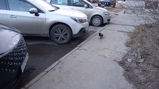 Уличный котик ест, и к нему пришла наглая ворона! ^^